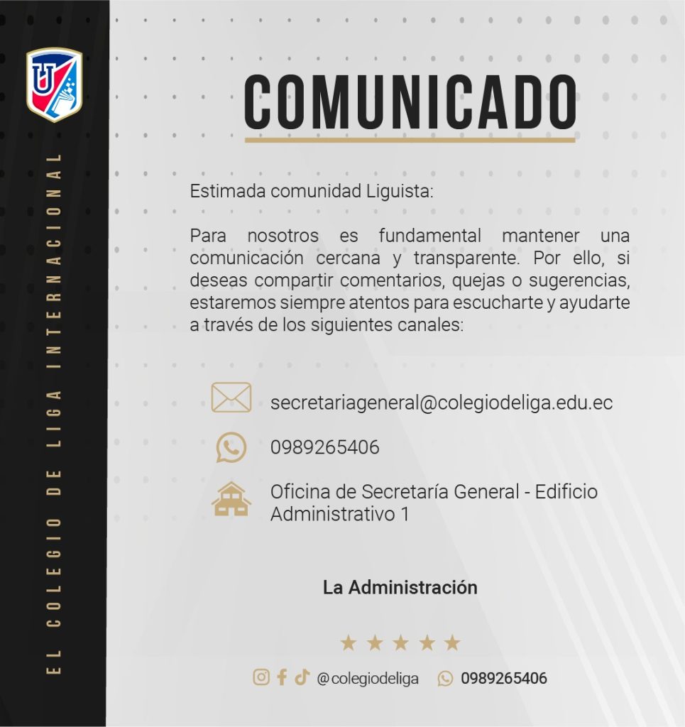 Para mayor información:098 926 5406 / secretariageneral@colegiodeliga.edu.ec